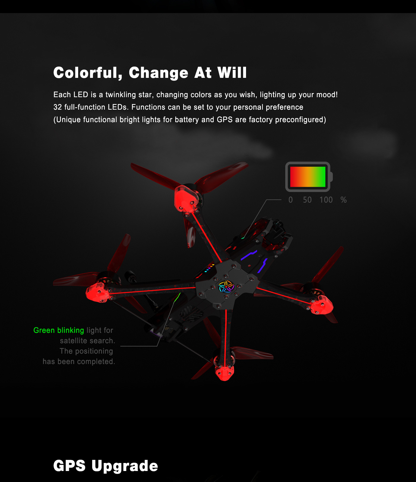 - A whole lot of 34 LED's that are both stylish yet practicalindicating battery levels or GPS 3D lock