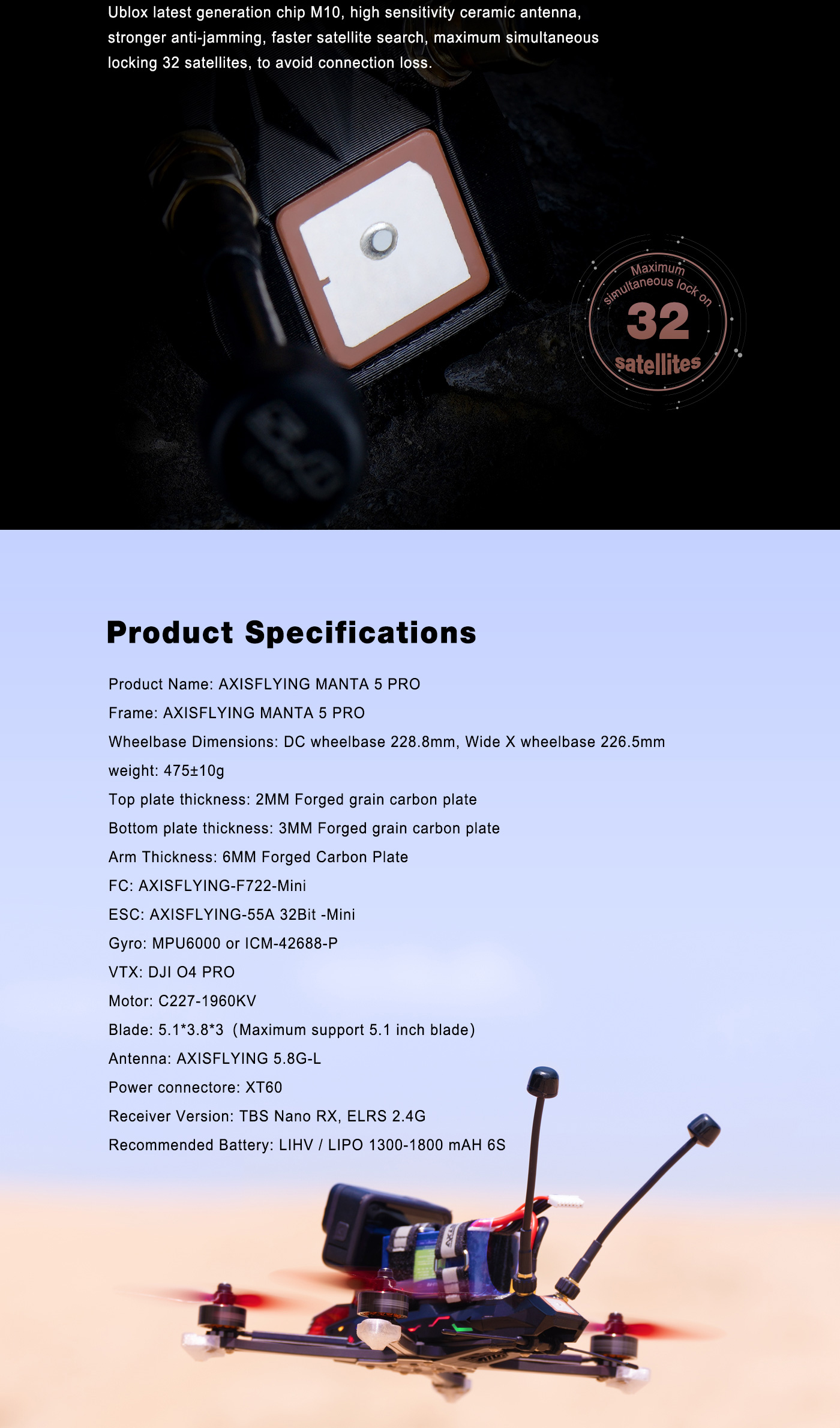 Blade: 5.1*3.8*3(Maximum support 5.1 inch blade)Antenna: AXISFLYING 5.8G-L
